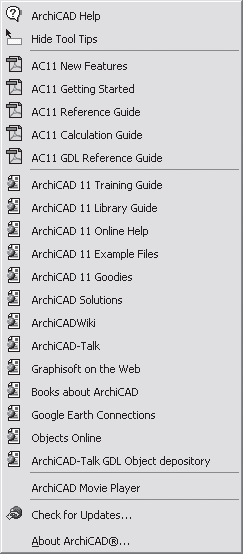 В третьей области меню Help (Помощь) собраны команды, позволяющие запустить сайты с информационными ресурсами по ArchiCAD: от документации и интерактивных обучающих систем до пользовательских форумов и списков литературы.