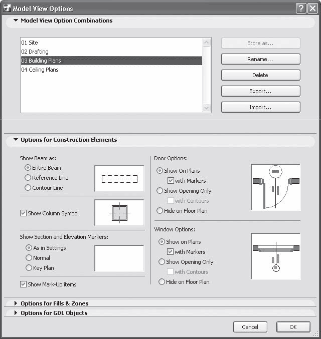 В области Options for GDL Objects (Параметры GDL-объектов) расположен переключатель Story Viewpoint Type (Тип отображения), определяющий вид условных обозначений для таких объектов, как потолочные светильники, вентиляционные решетки или детекторы дыма. В зависимости от установки переключателя в одно из положений – Floor Plan (План этажа) или Ceiling Plan (План перекрытия) – изменяется вид условного обозначения этих объектов.
