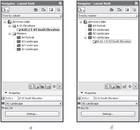 • Tree by master (По шаблонам) – основу структуры составляют листы шаблонов, которые являются папками для связанных с ними листов чертежей (рис. 13.8, б).