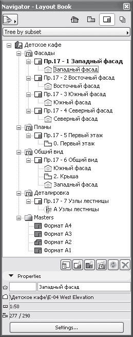 Посмотрите на палитру навигатора, переключив ее в режим отображения книги чертежей (рис. 13.18). Книга чертежей рассматриваемого проекта состоит из четырех подмножеств: Фасады, Планы, Общий вид и Деталировка. В подмножестве Фасады находятся четыре чертежа: Пр.17 – 1 Западный фасад, Пр.17 – 2 Восточный фасад, Пр.17 – 3 Южный фасад, Пр.17 – 4 Северный фасад, на каждом из которых расположено по одному виду. По-другому выглядит подмножество Общий вид. В нем находится один чертеж, на котором расположены три вида. По одному чертежу с одним видом на каждом содержат подмножества Планы и Деталировка. В разделе Masters (Шаблоны) определены четыре шаблона листа чертежа.