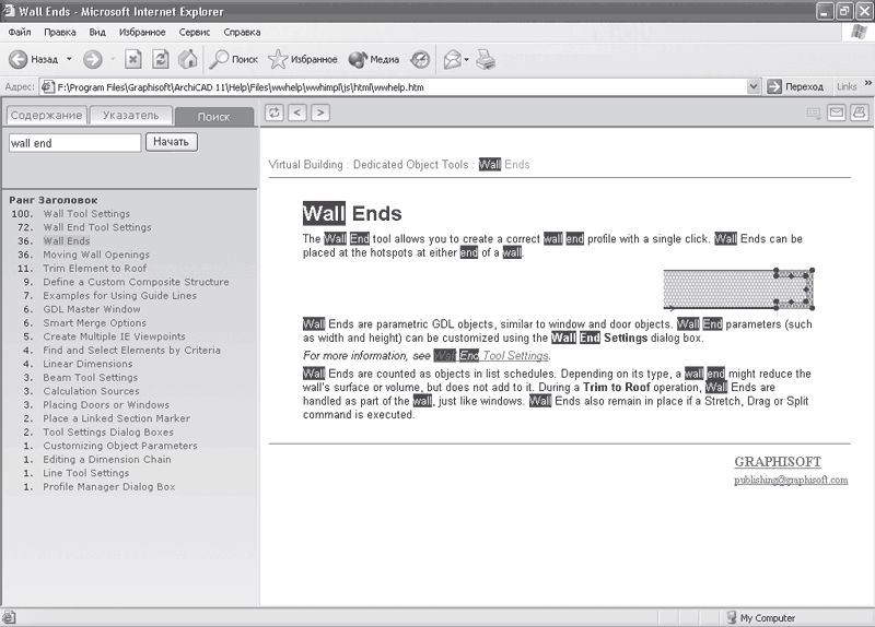 Последний механизм поиска информации, который так и называется – Поиск, становится доступным при переходе на одноименную вкладку. В отличие от предыдущего механизма, при котором список выводимых слов и словосочетаний, находящихся в файле помощи, специально подготовлен и помечен, рассматриваемый механизм осуществляет «настоящий» поиск. Для этого необходимо ввести нужную последовательность символов в текстовое поле и щелкнуть на кнопке Начать. Файлы системы помощи ArchiCAD будут просканированы, и разделы, в которых найдены слова, входящие во введенную последовательность, отобразятся в левой области окна. Щелчок на одном из найденных разделов приведет к отображению в правой области окна содержащейся в нем информации, причем найденные слова будут выделены (рис. 2.23).