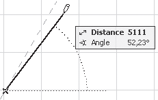 2. Переместите указатель мыши до точки, в которой должен находиться конец линии. В процессе перемещения от маркера начала линии до указателя мыши тянется так называемая «резиновая нить», отображающая текущее положение создаваемого объекта. Синхронно с указателем мыши перемещается полупрозрачное табло, на котором отображаются текущая длина отрезка и угол его наклона относительно горизонтальной оси (рис. 3.7).