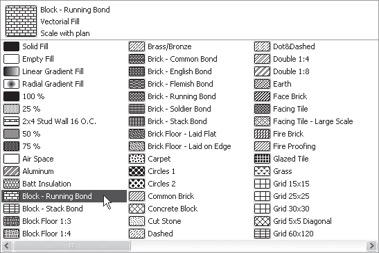 Щелчок на кнопке выбора типа штриховки, расположенной под кнопкой выбора типа линии, открывает список стандартных типов штриховки (рис. 3.31). Обратите внимание на изменение внешнего вида кнопки, предназначенной для выбора типа штриховки, при подведении указателя к конкретному элементу списка. При щелчке кнопкой мыши на активном (подсвеченном) элементе списка выбранный тип штриховки устанавливается в качестве текущего.