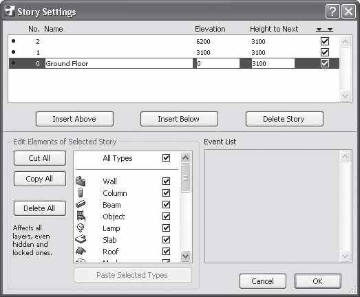 При проектировании в среде ArchiCAD пользователь работает с этажом. Так называется ограниченное определенной высотой пространство, в котором размещаются строительные элементы, детали конструкций, объекты интерьера и т. п. Пользователь имеет возможность переключаться между этажами, копировать и переносить объекты с этажа на этаж, видеть одновременно несколько этажей с целью определения относительного размещения объектов, то есть выполнять полноценную работу проектировщика.