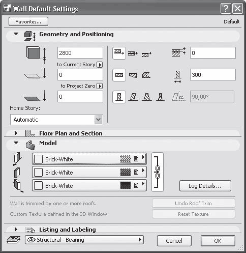 Элементы управления настройками параметров стен сгруппированы в четырех областях. Рассмотрим их по порядку.