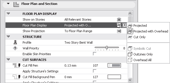 В области Floor Plan and Section (Вид в плане и сечения), включающей в себя четыре раздела, настраиваются параметры проекций объектов, отображаемых на плане этажа. Настраиваемые элементы каждого раздела представлены в виде списка. Чтобы активизировать элемент, щелкните на нем кнопкой мыши, после чего вы сможете настроить его параметры. Если установка какого-либо параметра требует выбора значения, то в конце строки появляется кнопка