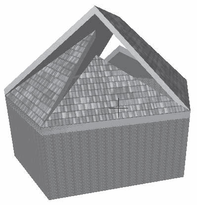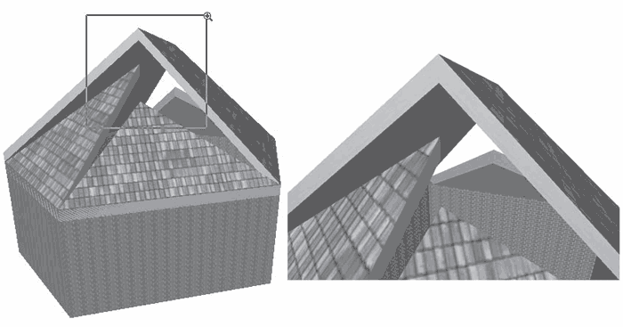 1. Используя режим Orbit (Облет), разверните объект приблизительно так, как показано на рис. 4.53. Как видно из рисунка, четырехугольные скаты сопряжены правильно, а вот треугольные, несмотря на совпадение проекций их ребер на плоскость этажа с проекциями ребер четырехугольных скатов, в пространстве расположены совсем не так, как надо.