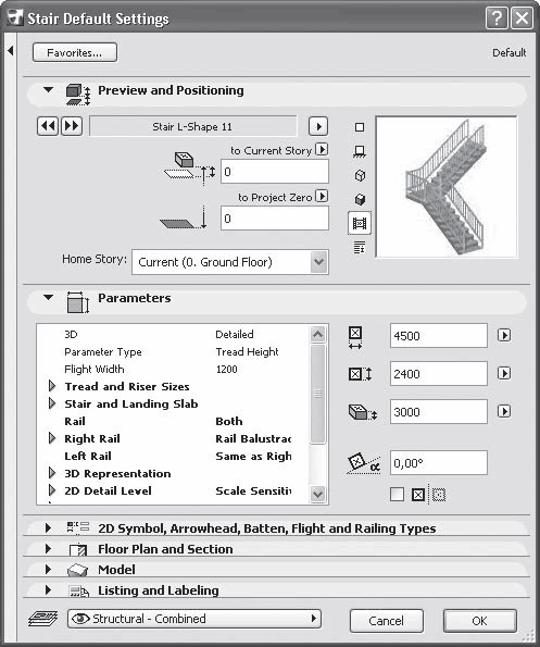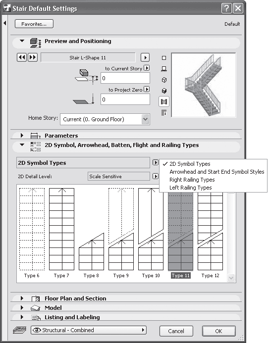 В области 2D Symbol, Arrowhead, Batten, Flight and Railing Types (Типы условных обозначений, размерных элементов, отделки, лестничных маршей и ограждений), которая появляется при выборе стандартных лестниц, можно настроить дополнительные параметры. При щелчке на верхней кнопке