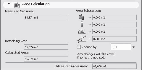 В разделе Area Subtraction (Вычитаемая площадь), который находится в правой части области, расположены четыре поля, помеченных значками стены, колонны, заштрихованного контура и разреза крыши. Если в списке Relation to Zones (Отношение к зонам) области Listing and Labeling (Сметы и выноски) окна настроек стен и колонн, находящихся в пределах зоны, были выбраны пункты Vertical Zone Boundary (Вертикальная граница зоны) или Reduce Zone Area Only (Исключить только площадь), то в соответствующих полях будет отображена площадь этих объектов, исключаемая из общей площади зоны.