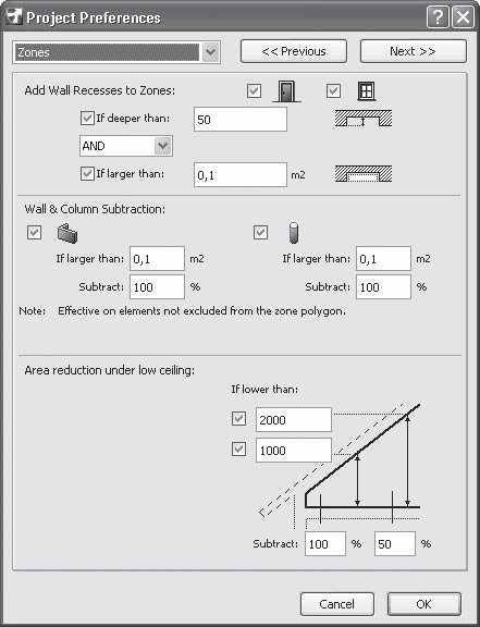 Кроме колонн и стен, на площадь и объем зоны могут оказывать влияние другие объекты. Это влияние можно определить, задав значения параметров в окне Project Preferences (Настройки проекта), которое вызывается командой Options -> Project Preferences -> Zones (Параметры -> Настройки проекта -> Зоны) (рис. 6.5).