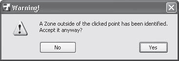 Различия в построении зон последними двумя методами хорошо заметны при щелчке кнопкой мыши на свободном месте рабочего поля, то есть вне замкнутого контура. В этом случае программа попытается найти ближайший замкнутый контур, находящийся на горизонтальной или вертикальной линии, исходящей из точки щелчка. Если такой контур будет найден, появится окно с предупреждением A Zone outside of the clicked point has been identified. Accept it anyway? (Найден контур, внешний по отношению к точке щелчка. Использовать его в качестве зоны?) (рис. 6.7).