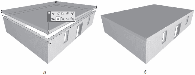 5. Щелкните кнопкой мыши в указанной точке. Перекрытие переместится в вертикальной плоскости так, что точка его привязки совместится с заданной точкой контура стены. Задача выполнена (рис. 8.15, б).