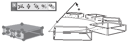 Метод Elevate (Возвышение) при выполнении операции Multiply (Тиражирование) в трехмерном режиме создает копии выделенных объектов в количестве, указанном в поле Number of copies (Количество копий). Причем копии располагаются строго по вертикали над или под выделенными объектами. Величина возвышения копий объектов зависит от вектора возвышения, который определяемым в процессе выполнения операции. Эта величина также зависит от способа распределения копий объектов в создаваемом массиве. Способы распределения Increment (Приращение), Distribute (Распределить), Distribute – 1 (Распределить – 1) и Spread (Ширина) были подробно описаны при рассмотрении операции Multiply (Тиражирование) (см. подраздел «Методы редактирования объектов» раздела «Редактирование объектов» гл. 3).