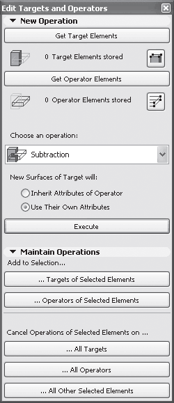 В логической операции участвуют два вида объектов. К первому относятся объекты, над которыми будет выполняться операция, то есть обрабатываемые объекты. В терминологии разработчиков системы ArchiCAD такие объекты называются целевыми элементами, или просто целями. Ко второму виду относятся объекты, с помощью которых будет выполняться операция над целевыми элементами, то есть обрабатывающие объекты. Их называют операторами.