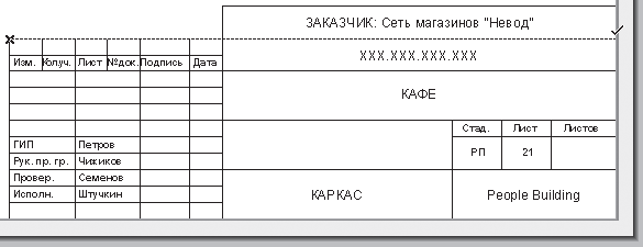 Привяжем вводимый текст к штампу. Принципы оформления чертежей, в том числе и создание форматов, будут рассмотрены в следующих главах, поэтому пока просто нарисуйте на плане этажа прямоугольник размером 185 x 55, используя инструмент Line (Линия). Я буду использовать в качестве иллюстрации готовый заполненный штамп.