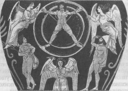 Рис. 7. Иксион, привязанный к колесу (роспись древней вазы).