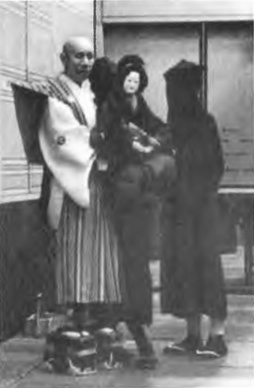 Японский театр кукол. Сложный спектакль играет актер, стоящий на котурнах. Ему помогают два ассистента в масках и черных халатах. Они манипулируют куклами на глазах аудитории, а декламаторы-певцы, сидящие в стороне, произносят диалог. Театр кукол связан с дзэн не так сильно, как театр Но, и все же в его представлениях выражаются определенные качества дзэн, так же, как в искусстве владения мечом и стрельбы из лука. (см. Раздел VI, «Всеобщий дзэн»).