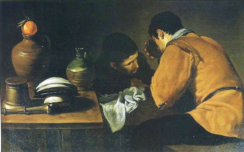 Сюжет с удручающей обстановкой трактира обыгран также в картине «Двое юношей у стола» (около 1618, Музей Веллингтона, Лондон). Мы видим, как сохнут на переднем плане стопка чистых тарелок, перевернутая железная чашка, глиняный кувшин и деревянная толокушка. Рядом лежит скомканная тряпка, видимо, служившая полотенцем. Юноши, один из которых допивает свой напиток, склонились над столом и о чем-то тихо беседуют. Сюжет здесь обыденный, спокойный и простой. Именно поэтому ценителями живописи в Севилье были встречены с презрением работы молодого Веласкеса, «низменный сюжет» которых не вызывал у публики восхищения.