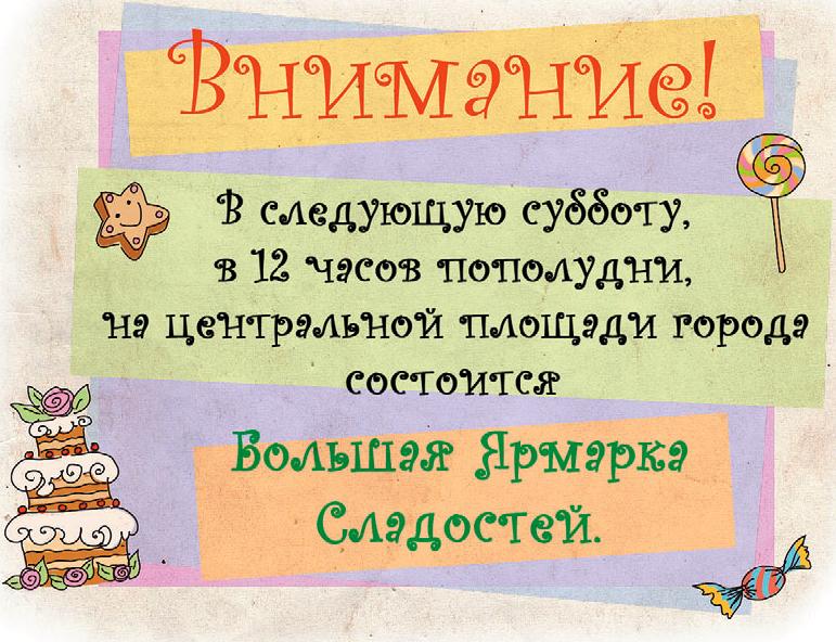 В следующую субботу, в двенадцать часов пополудни, на центральной площади города состоится Большая ярмарка сладостей.