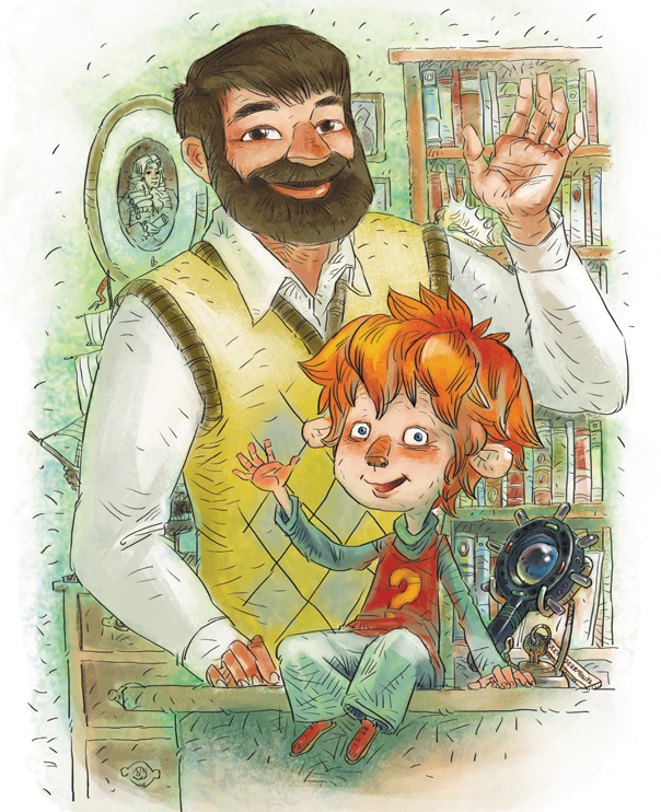 Здравствуйте, ребята! Меня зовут Чевостик. Я живу на книжной полке в библиотеке у дяди Кузи. Не удивляйтесь, я небольшого роста, а нижняя полка в книжном шкафу дяди Кузи очень высокая и просторная, поэтому мне на ней хорошо и удобно. Какой я? Похож на обыкновенного мальчишку, волосы рыжие, характер весёлый. Дядя Кузя в шутку зовёт меня Чевочка с хвостиком. Но никакого хвоста у меня нет, зато есть ушки на макушке. Больше всего на свете я люблю узнавать новое, поэтому всё время задаю дяде Кузе всякие вопросы. О чём бы я ни спросил, он всё знает и мне рассказывает. Это потому, что дядя Кузя очень умный. Он прочитал много-много разных книг. А ещё мы с ним любим путешествовать! В путешествиях нам помогает времяскок. Это такой прибор, его дядя Кузя изобрёл. Набираешь на времяскоке место и время, куда хочешь попасть, раз-два – и уже там! Сегодня мы наверняка тоже куда-нибудь отправимся!