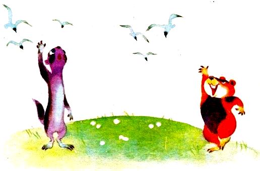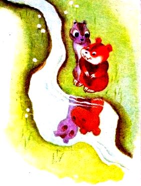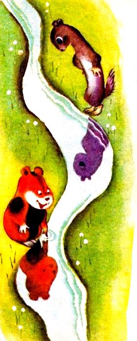 С этого дня Суслик и Хома прибегали каждый день в ручей взглянуть. Посмотрят на свои отражения, отвернутся и снова посмотрят… И так приятно им было думать, что плывут теперь их отражения бесконечной цепочкой через всю большую страну: сначала по ручью, потом по реке, потом по морю. Плывут себе, волосок к волоску вылизан, лапы гордо на груди сложены, рты до ушей улыбаются. А все любуются ими и весело кричат:
