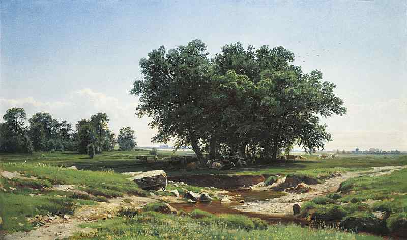 Эпичность представлялась людям во времена Шишкина неким архетипом, в котором проявлена национальная сущность огромной страны. Эпос — это как бы голос всего народа. Шишкин, как никто из пейзажистов, сумел запечатлеть и характер народа, и облик национальной природы. В пейзажном образе художника как бы звучит «дух и образ великого, могучего пространства»[22], именуемого Россией. Шишкинская эпичность — это вместе с тем особый торжественный слог, которым изъясняются о явлениях важных и эпохальных. В образах художника живет эпоха, мнится могучий неторопливый народ, видится огромная бескрайняя страна, которой нет конца и которая все удаляется и удаляется в бескрайние горизонты.