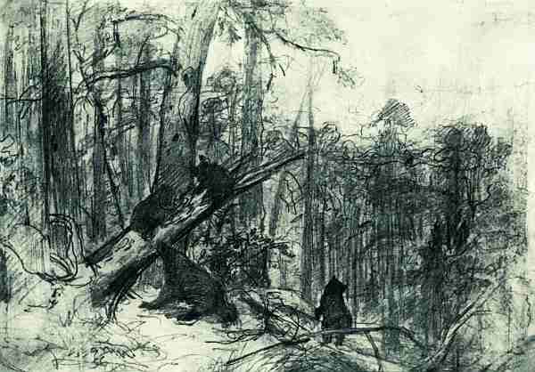 Между тем идея картины принадлежала, видимо, Константину Савицкому. В одном из писем он писал: «Затеял как-то картину с медведями в лесу, приохотился к ней И. И. Шишкин и взял на себя исполнение пейзажа»[23]. Судя по этюду, Шишкин начал параллельную работу над темой и решил ее более удачно. Савицкий считал, что в произведении ему принадлежит четвертая доля. Именно так были распределены деньги от продажи.