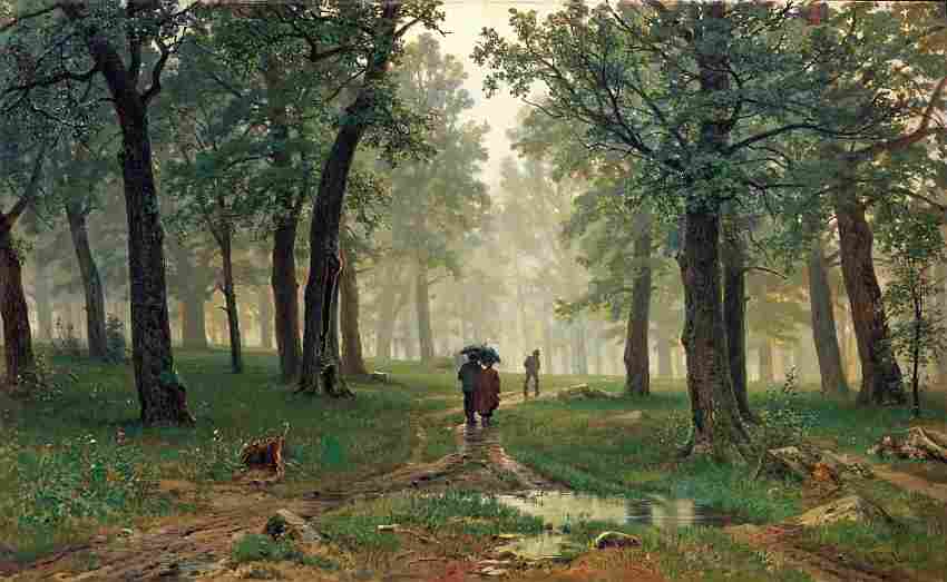 Чуткость К СОСТОЯНИЮ ПОГОДЫ В ЭТОМ полотне близка импрессионистической, только в картине нет импрессионистической интимности. И не потому, что формат картины больше, нежели обычная работа французских импрессионистов, что сообщает ей некую монументальность, — сам широкий панорамный охват композиции не позволяет говорить о камерности пейзажа. Шишкин, как обычно, изъясняется не выразительностью мазка, не касанием кисти, не форсированием цвета, не эффектной композицией, а верностью воспроизведения на холсте зыбкой мокрой природы, неустойчивость которой компенсируется стабильной уравновешенной композицией. Последняя, впрочем, как всегда, у художника незамысловата. По краям полотна цвет как бы «разрежается», картинная плоскость отступает в центре, давая возможность глазу проникнуть в неглубокое пространство. Сила Шишкина в натуральности изображения и выборе мотива, что выдвигает его в число самых значительных пейзажистов реалистического направления XIX века, делают его певцов жизни природы.