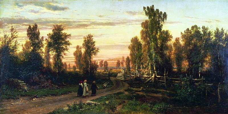 Однако показанную на первой передвижной выставке картину Вечер (1871) нельзя отнести к удачам художника. Картина с крестьянками, возвращающимися с работы, скорее жанр, чем пейзаж. Пейзаж с людьми был довольно распространен в искусстве 1860-1870-х годов. Человеческое присутствие играло двоякую роль: во-первых, как оживление пейзажа и, во-вторых, людские фигуры являлись как бы мерой, которой зрительно измерялся масштаб изображенного пространства. Но существовало еще одно неявное обстоятельство: присутствие людей одухотворяло природу, увязывало жизнь природы с жизнью народа. В таком подходе усматривалась своя философия: жизнь человека в окружении природы возвращала его к первозданным истокам, придавала естественность его бытованию на земле. Вечный зов природы оборачивался в пейзажном жанре своеобразной религией природы, а художник виделся послушником, проникающимся ее таинствами.