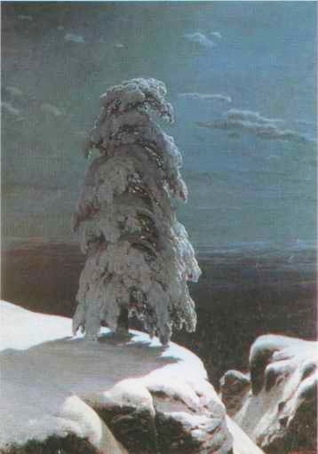 В 1891 году Шишкин создал еще одну романтическую картину «На севере диком…». На сей раз по стихотворению Лермонтова. Стилистика этой картины вполне в духе Куинджи. Это было время тесной дружбы двух художников. Они вместе включились в подготовку обновленного устава Академии художеств, предполагая войти в ее члены. Александра Комарова сообщает: «С Куинджи Шишкин был в самых лучших отношениях, обезоруживаемый его уступчивостью; Куинджи бывал постоянно у Шишкиных, чуть не каждый день, как свой человек; после обеда поднимались разные интересные вопросы, например, об искусстве как религии будущего»[16]. О последнем замечании есть смысл задуматься изучающим творчество Шишкина и Куинджи; вероятно, каким-то образом его отголоски слышны в знаменитой максиме Достоевского «красота спасет мир». Религия имеет силу убеждения и влияния на человека, искусство располагает этими же качествами, выраженными в специфической форме прекрасного. Может быть, куинджиевские отвлечения в поисках вечной, космической красоты, обращенной к земле, к миру людей, являлись некоторыми попытками создать религию прекрасного и вечного. Может шишкинскую картину «Среди долины ровныя…», обращенную к самочувствию человека в безбрежном мире, тоже можно отнести если не к поискам религии, то, по крайней мере, к приближению к проблемам философским, а не конкретно изобразительным.