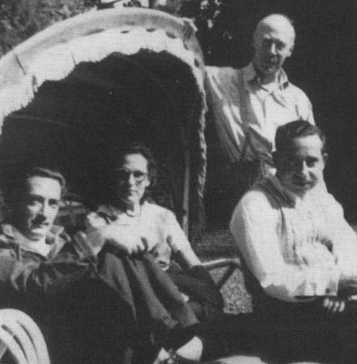 Генри Миллер (стоит) с Сальвадором Дали, его женой Галой и Барнетом Рудером (сидит справа). США, Виргиния. Лето 1940 г.