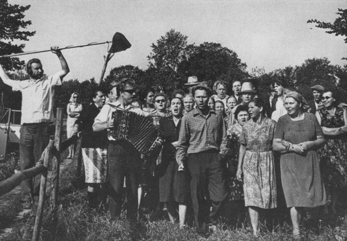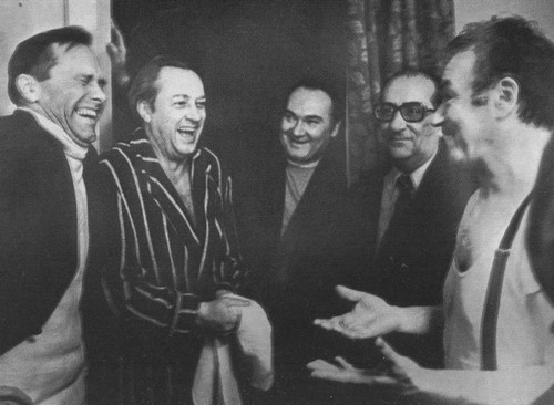 С актерами ленинградского БДТ. «К театру меня влечет. Охота понять, в чем его живая сила, феноменальная стойкость. Ведь мне казалось, что он доживает дни, что его чрезмерная условность все же убьет его, а он живет и живет»