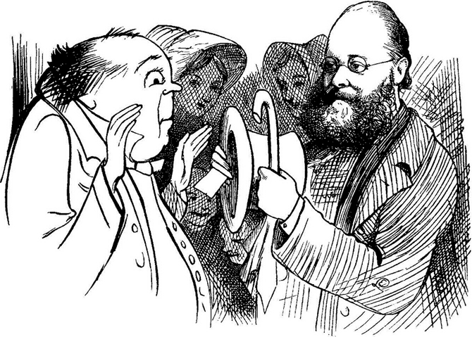 Lear showing a doubting stranger his name on his hat to prove that Edward Lear was a man and not merely a name.