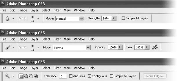 На рис. 6.9 можно видеть, как выглядит панель управления при работе с разными инструментами (сверху вниз): Blur (Размытие), Brush (Кисть) и Magic Wand (Волшебная палочка). Для каждого инструмента она отображает его, и только его настройки. С разными состояниями панели управления мы познакомимся, когда будем изучать различные инструменты.