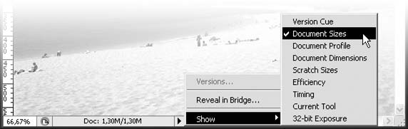 В строке состояния крайнюю левую позицию занимает числовое поле, в котором указан масштаб отображения изображения (масштаб и цветовой режим также указаны в заголовке окна). Чуть правее показывается справочная информация (на рис. 6.10 это размеры файла документа); установить строку состояния на отображение нужной информации можно с помощью черной стрелки-треугольника рядом с полосой прокрутки (рис. 6.11), которая вызывает собственное меню строки состояния.