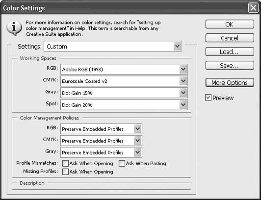Профиль CMYK необходимо сменить, поскольку американские стандарты сильно отличаются от европейских (читай: от русских). Нам лучше подойдут настройки Euroscale (coated для мелованной и глянцевой бумаги, uncoated для обычной). В этом случае при преобразовании изображений в режим CMYK программа будет действовать более точно.