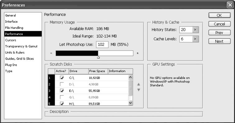 Рис. 6.13. Настройки Adobe Photoshop, раздел Performance (Производительность)