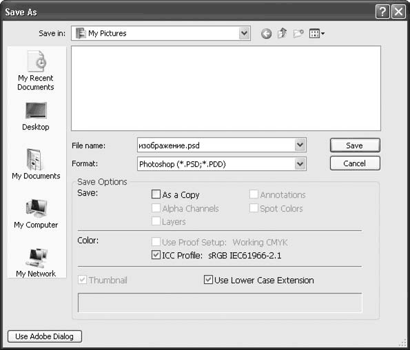Имя файла указывается в поле File Name (Имя файла). Расширение файла можно не указывать: оно будет назначено автоматически при выборе формата в раскрывающемся списке Format (Формат). Выбрать каталог для сохранения можно из раскрывающегося списка Save In (Сохранить в) и поля в центре окна.