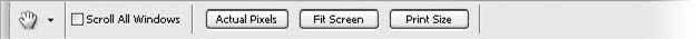 • кнопки Actual Pixels (Реальные пикселы), Fit Screen (Уместить в экране), Print Size (Печатный размер), аналогичные кнопкам, показываемым при работе с инструментом Hand (Рука).
