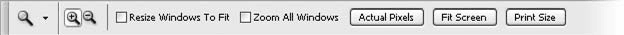 При работе с инструментом Zoom (Масштаб) панель управления содержит следующие параметры (слева направо):
