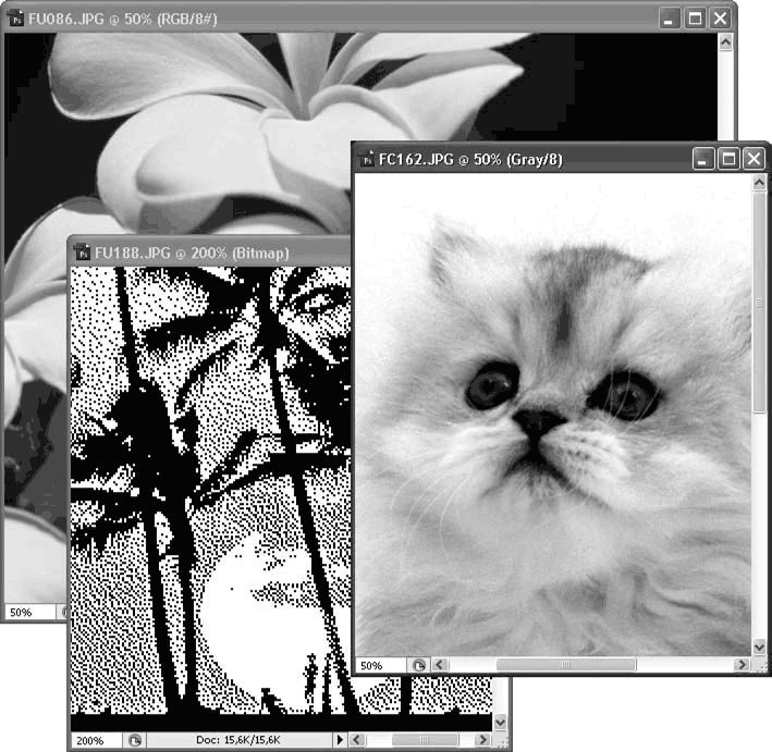 На примере, показанном на рис. 8.1, приведены три разных документа в разных цветовых режимах: RGB, Grayscale (Оттенки серого) и монохромное изображение. Для режимов RGB и Grayscale (Оттенки серого) указаны также данные о глубине разрешения цвета: 8 бит/канал. Из приведенных изображений два (в режиме оттенков серого и монохромное) будут сильно ограничены в возможностях редактирования: к примеру, для черно-белого изображения теряет смысл коррекция цвета, а с монохромным не работают ни коррекция цвета и яркости, ни фильтры. Для полноценной работы с этими изображениями, вероятно, придется сменить цветовой режим.