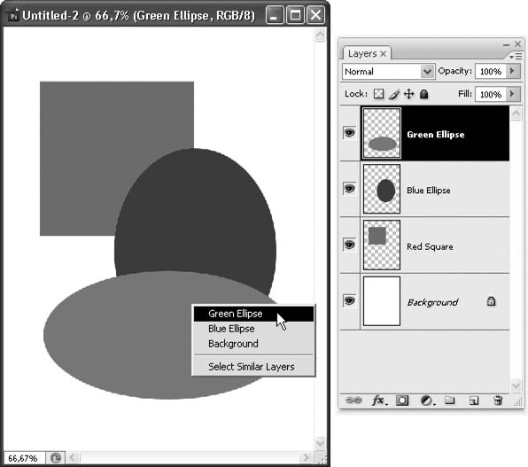 Выделение слоя инструментом Move (Перемещение) несколько сложнее. Щелкнув правой кнопкой мыши в любом месте изображения, вы увидите контекстное меню, в котором перечислены названия всех слоев, непрозрачных в данной точке (рис. 10.5). Вызвав контекстное меню, мы можем выбрать из него интересующий нас слой, и он станет выделенным.