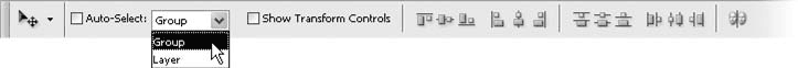 Раскрывающийся список Auto-Select (Автовыбор) позволяет нам указать, какие объекты будут выбираться щелчком кнопки мыши: то ли это будут отдельные слои (значение Layer (Слой)), то ли это будут группы слоев (значение Group (Группа)). Разумеется, эта настройка имеет смысл, только если вы использовали группировку слоев.