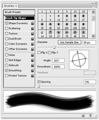 Ползунок Spacing (Расстояние) и активизирующий эту настройку флажок управляют тем, как будет формироваться след кисти. Хотя в большинстве случаев это и не видно невооруженным глазом, след кисти не сплошной, а формируется из отдельных отпечатков.