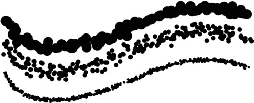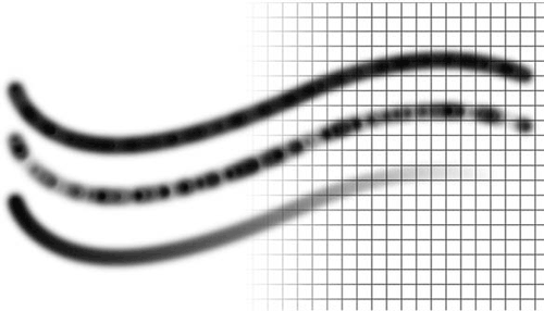 При распылении линия теряет «плотность», поскольку мазки больше не образуют непрерывной линии. Ползунок Count (Количество) позволяет увеличивать число мазков в некоторое количество раз – благодаря этому они плотнее заполняют линию. С помощью ползунка Count Jitter (Случайное изменение количества) можно изменять количество мазков случайным образом – благодаря этому линия будет в некоторых местах плотнее, а в некоторых – разреженнее. Наконец, используя раскрывающийся список Control (Управление), можно осмысленно управлять изменением количества мазков все по тем же хорошо известным нам принципам.