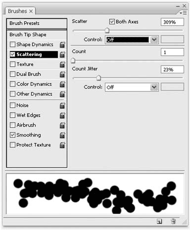 Раздел Scattering (Распыление) (рис. 12.28) позволяет нам разрушить непрерывный след кисти и раздробить его на отдельные отпечатки – этот прием используется только в декоративных целях. Достигается эффект за счет смещения отдельных отпечатков кисти в разные стороны.