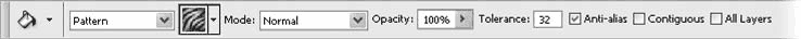 Настройки инструмента Paint Bucket (Заливка) (рис. 12.34) включают в себя уже известные нам раскрывающийся список Mode (Режим) и поле Opacity (Непрозрачность). Кроме этого, основная настройка – раскрывающийся список, позволяющий выбрать, что будет использоваться для заливки – цвет переднего плана или узор. К сожалению, инструмент Paint Bucket (Заливка) не позволяет использовать другие варианты заливки – например, установить произвольный цвет непосредственно в настройках инструмента.