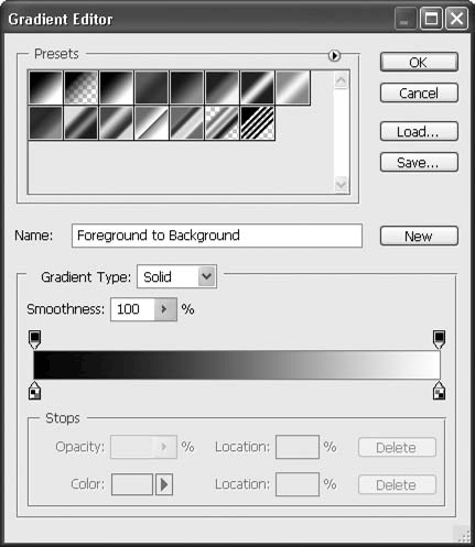 Поскольку в реальной работе нельзя ограничиться только выбором готовых настроек градиента, следует также научиться создавать собственные градиенты. Для этого достаточно щелкнуть кнопкой мыши на полоске градиента на панели управления (именно на полоске, а не на стрелочке, раскрывающей меню выбора) – это действие отобразит окно настроек градиента (рис. 12.44).