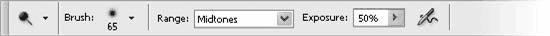 Инструменты Dodge (Осветление) и Burn (Затемнение) предназначены для контроля яркости изображения. Оба инструмента обладают идентичными настройками (рис. 17.5), и разница между ними заключается только в воздействии: один осветляет участки изображения, а другой затемняет.