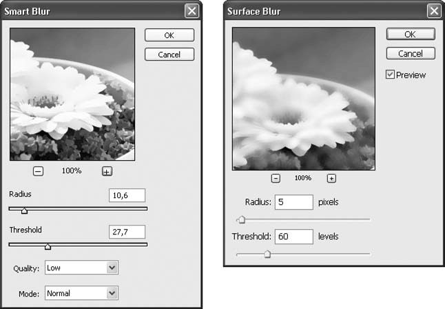 Рис. 18.9. Окна команд Smart Blur (Умное размытие) и Surface Blur (Размытие поверхности)
